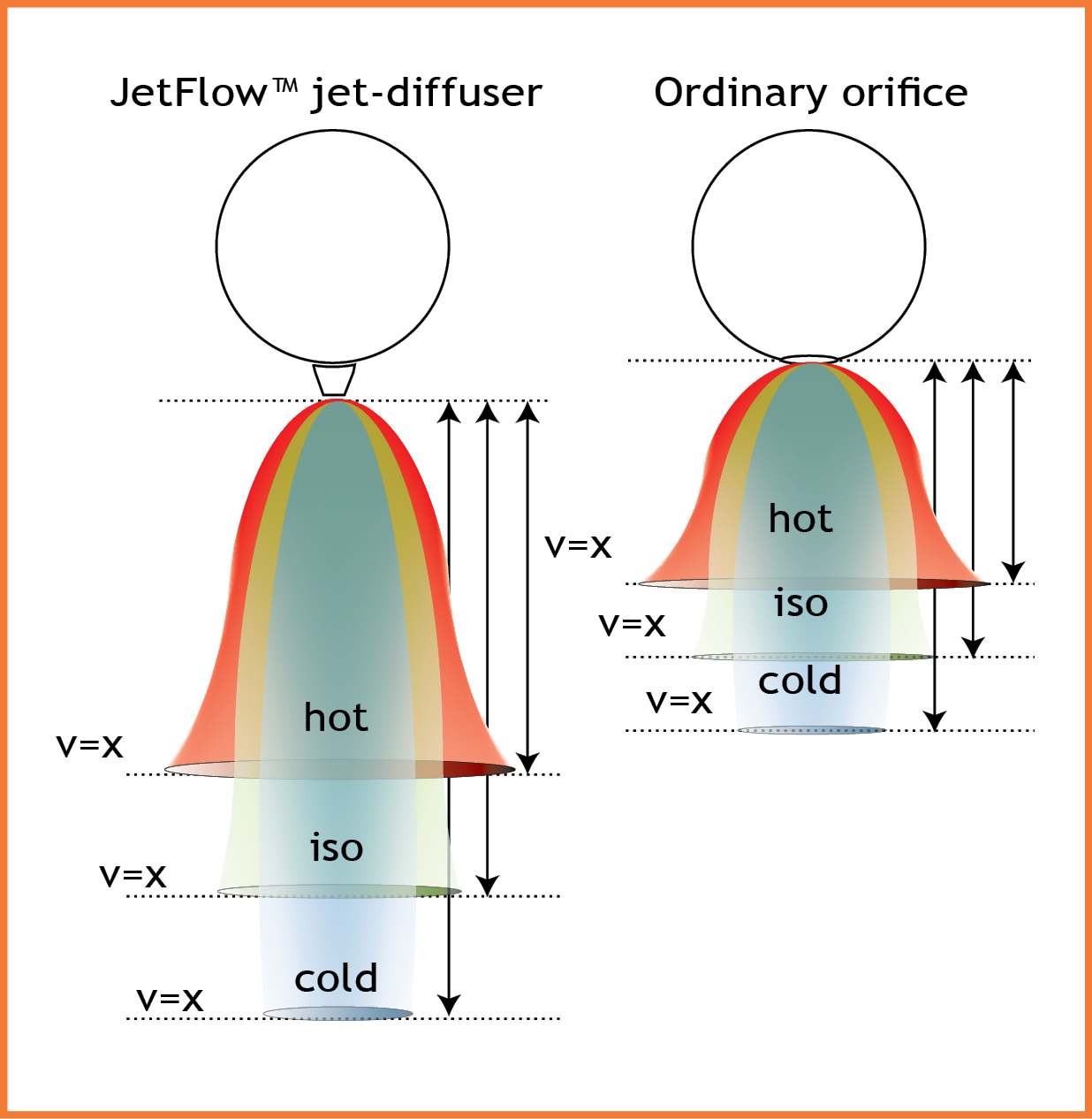 JetFlow™ accelerates and accurately throws the air perpendicular to the duct creating longer throws than conventional orifices (fig. 7).