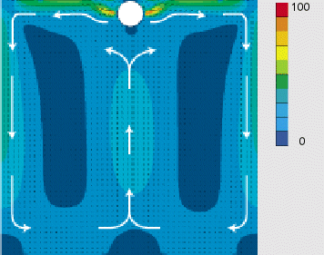 In MeshFlow™, the air leaves the duct through a mesh opening along the length of the duct. Increasing the air velocity through the mesh opening creates a pulsating effect that throws the air and mixes it with the air in the room.